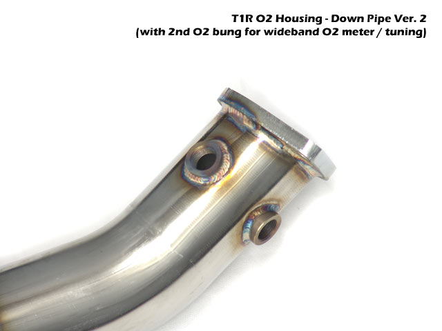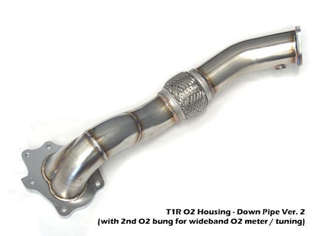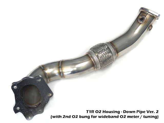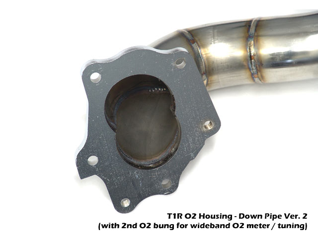 T1R O2 Housing - Down Pipe Ver. 2 for Evo X The T1R O2 Housing - Down Pipe is the key to unlocking the full power potential of the Evo X! Our own tests, and those of other tuners have confirmed that aftermarket down pipes do not make significant power gains at all as the stock down pipe is very efficient already. However, when the down pipe is combined with the O2 Collector Housing to make a one piece unit, the exhaust flow velocity is greatly increased. Substantial power gains are instantaneous, and there is even further potential for more power to be gained through tuning.